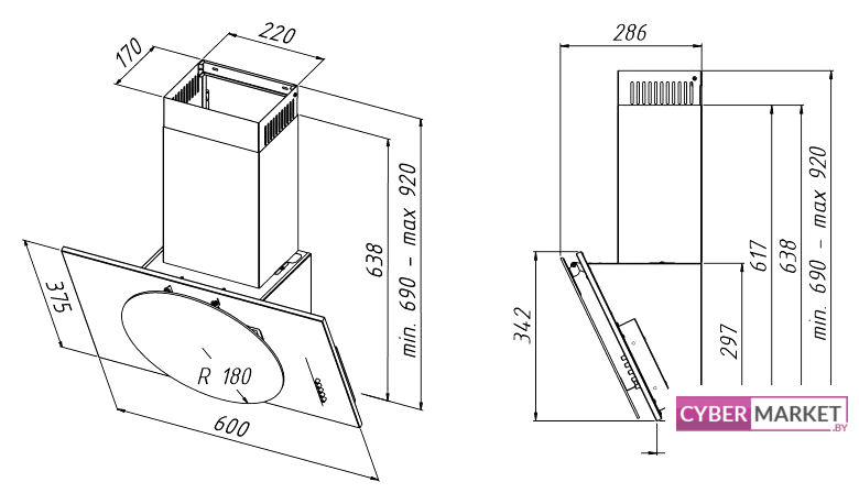 конструкция наклонная, монтаж настенный, ширина 60 см, управление механическое, производительность вытяжки 207 м³/ч, цвет серебристый/черный
