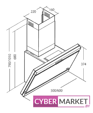 конструкция наклонная, монтаж настенный, ширина 60 см, управление механическое/кнопочное, производительность мотора 850 м³/ч, цвет нержавеющая сталь/черный