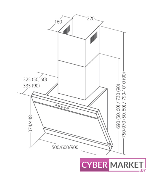 конструкция наклонная, монтаж настенный, ширина 60 см, управление механическое/кнопочное, производительность мотора 900 м³/ч, цвет черный