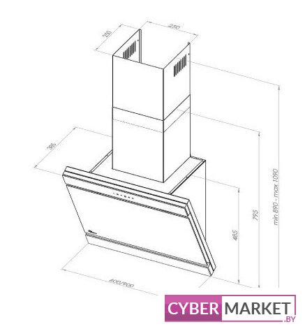 конструкция наклонная, монтаж настенный, ширина 60 см, управление сенсорное, производительность мотора 850 м³/ч, цвет черный