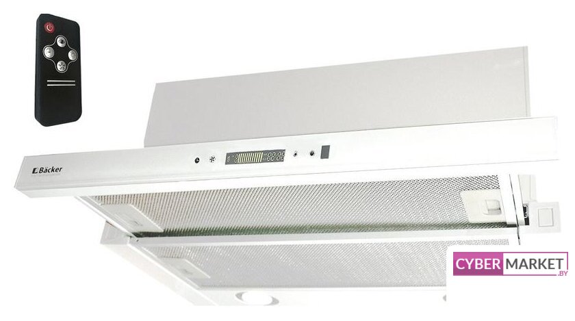 конструкция телескопическая, монтаж для встраивания, ширина 49.8 см, управление механическое/кнопочное, производительность мотора 550 м³/ч, цвет белый