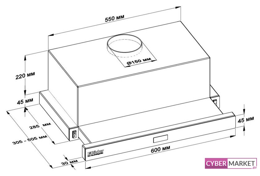конструкция купольная, монтаж настенный, управление электронное/кнопочное, производительность мотора 600 м³/ч, ширина 60 см
