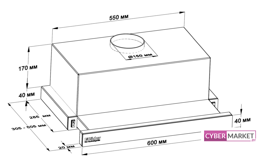 конструкция скрытая, монтаж для встраивания, ширина 52 см, управление механическое/кнопочное, производительность мотора 750 м³/ч, цвет черный