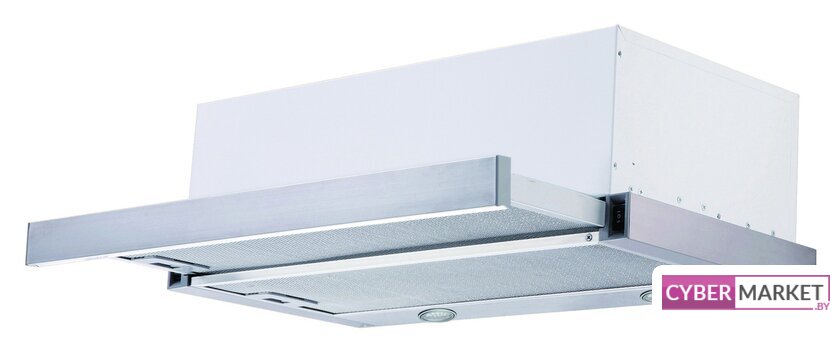 конструкция телескопическая, монтаж для встраивания, ширина 59.8 см, управление механическое/кнопочное, производительность мотора 320 м³/ч, цвет нержавеющая сталь