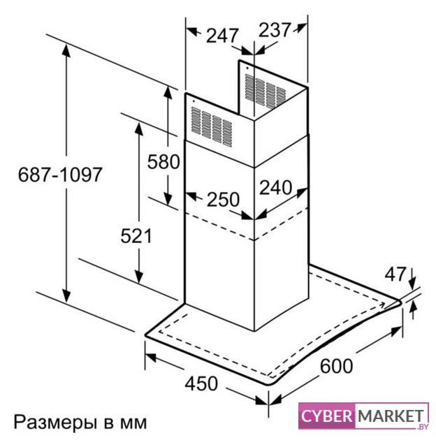 конструкция Т-образная, монтаж настенный, управление электронное/кнопочное, производительность мотора 1200 м³/ч, ширина 60 см