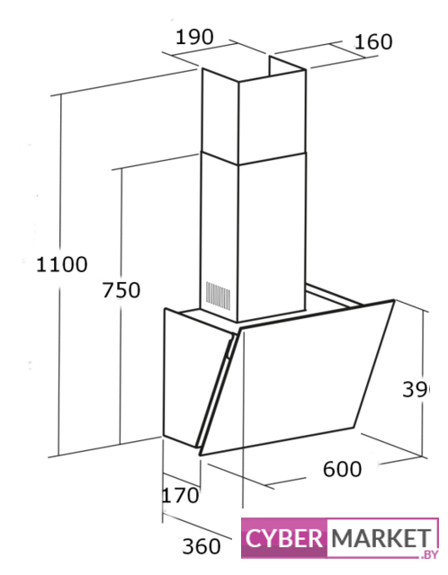 конструкция наклонная, монтаж настенный, ширина 90 см, управление механическое/кнопочное, производительность мотора 850 м³/ч, цвет черный