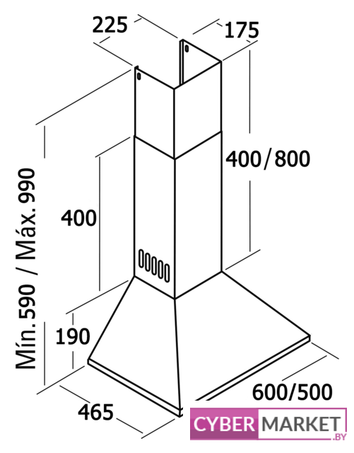 конструкция купольная, монтаж настенный, ширина 60 см, управление механическое/кнопочное, производительность мотора 750 м³/ч, цвет черный