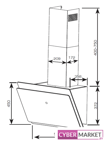 конструкция наклонная, монтаж настенный, ширина 60 см, управление механическое/кнопочное, производительность мотора 850 м³/ч, цвет черный