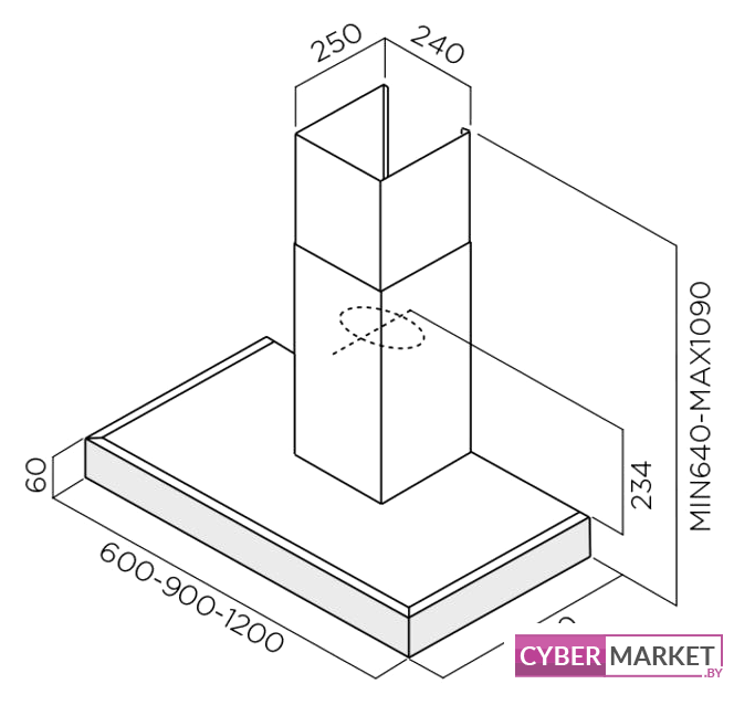 конструкция Т-образная, монтаж островной, управление сенсорное, производительность мотора 650 м³/ч, ширина 90 см