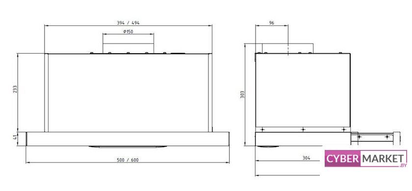 конструкция наклонная, монтаж настенный, ширина 49.5 см, управление механическое/кнопочное, производительность мотора 600 м³/ч, цвет черный