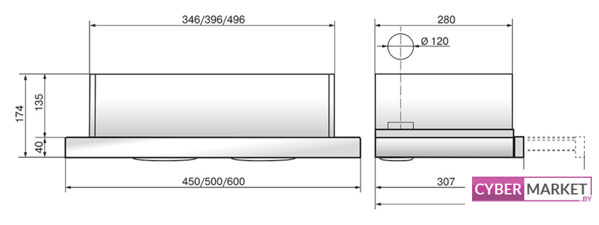 конструкция телескопическая, монтаж для встраивания, управление кнопочное, производительность мотора 390 м³/ч, ширина 60 см