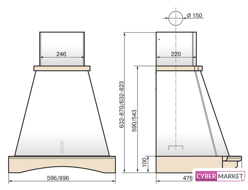 конструкция купольная, монтаж угловой, ширина 125.3 см, управление слайдерное, производительность мотора 650 м³/ч, цвет бежевый