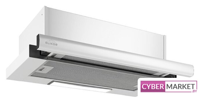 конструкция телескопическая, монтаж для встраивания, ширина 59.8 см, управление механическое/кнопочное, производительность мотора 670 м³/ч, цвет белый