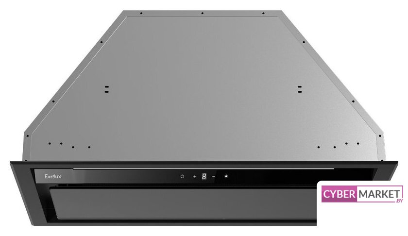 конструкция скрытая, монтаж для встраивания, ширина 59.8 см, управление механическое/кнопочное, производительность мотора 850 м³/ч, цвет черный
