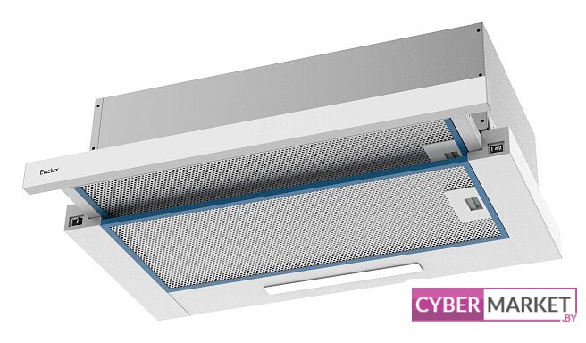 конструкция телескопическая, монтаж для встраивания, ширина 60 см, управление механическое/кнопочное, производительность мотора 430 м³/ч, цвет белый