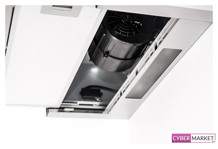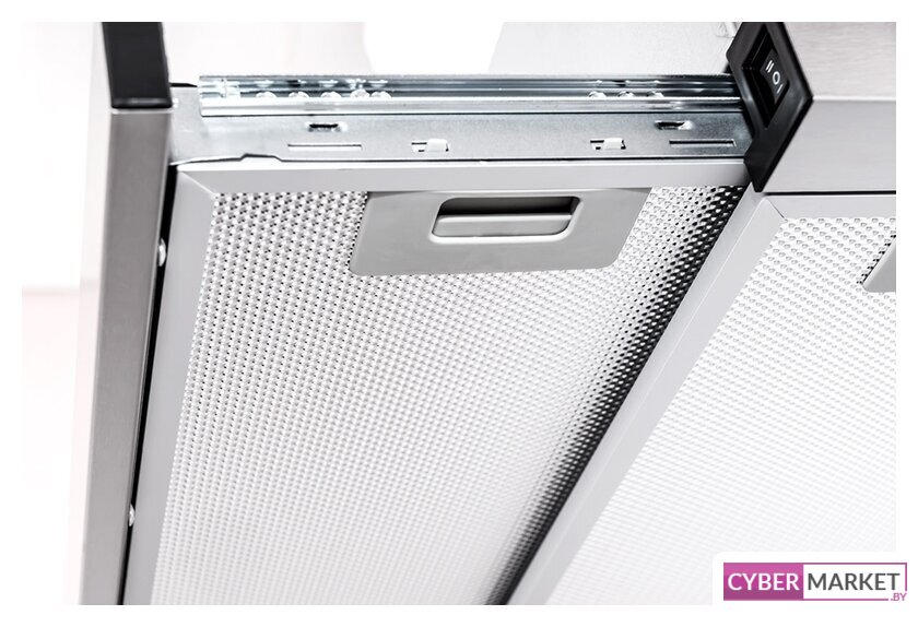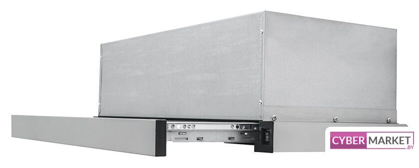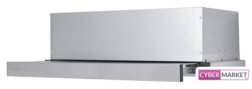 конструкция телескопическая, монтаж для встраивания, ширина 59.5 см, управление механическое/кнопочное, производительность мотора 600 м³/ч, цвет нержавеющая сталь