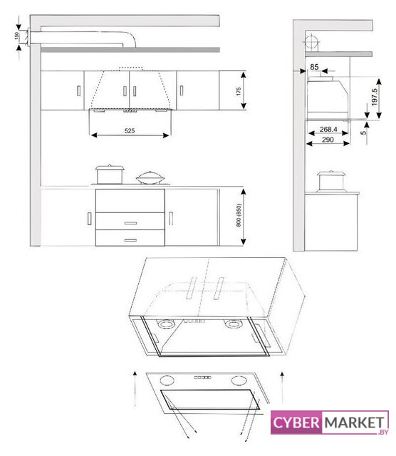 конструкция плоская, монтаж настенный, управление механическое/кнопочное, производительность мотора 320 м³/ч, ширина 60 см