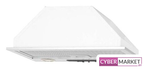 конструкция скрытая, монтаж для встраивания, ширина 52.5 см, управление механическое/кнопочное, производительность мотора 633 м³/ч, цвет белый