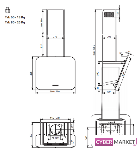 конструкция Т-образная, монтаж настенный, ширина 89.8 см, управление сенсорное, производительность вытяжки 480 м³/ч, цвет нержавеющая сталь/черный