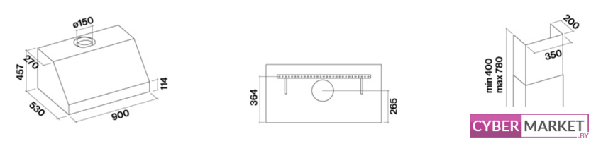 конструкция коробчатая, монтаж настенный, ширина 35 см, управление электронное/кнопочное, производительность мотора 800 м³/ч, цвет медный