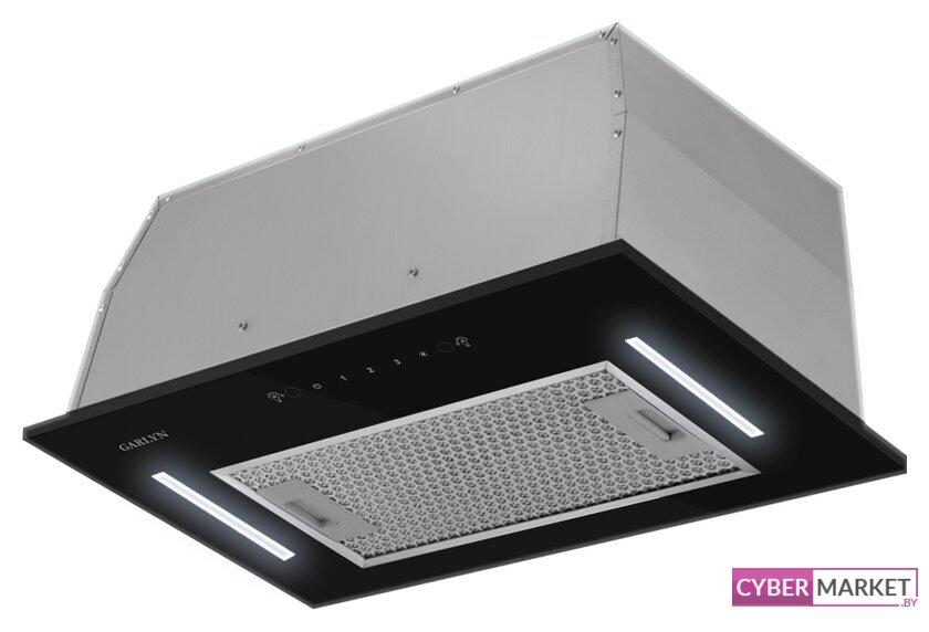 конструкция скрытая, монтаж для встраивания, ширина 52 см, управление сенсорное/жестами, производительность мотора 900 м³/ч, цвет черный