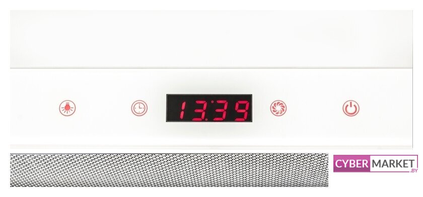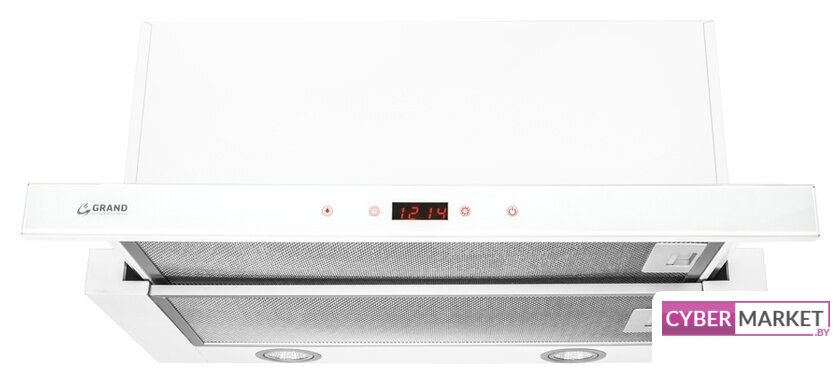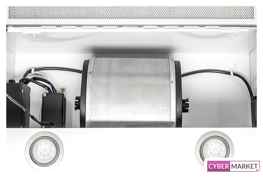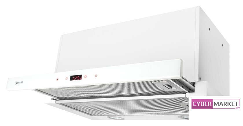 конструкция скрытая, монтаж для встраивания, ширина 59.8 см, управление механическое/кнопочное, производительность мотора 1050 м³/ч, цвет белый