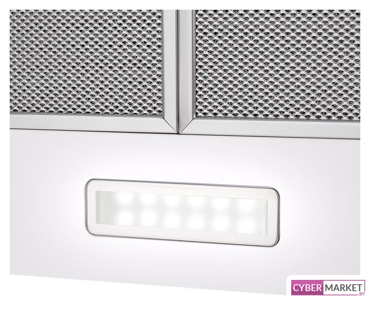конструкция телескопическая, монтаж для встраивания, ширина 59.5 см, управление механическое/кнопочное, производительность мотора 650 м³/ч, цвет нержавеющая сталь