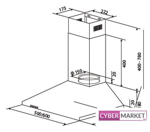 конструкция плоская, монтаж настенный, ширина 59.8 см, управление механическое/кнопочное, производительность мотора 600 м³/ч, цвет черный