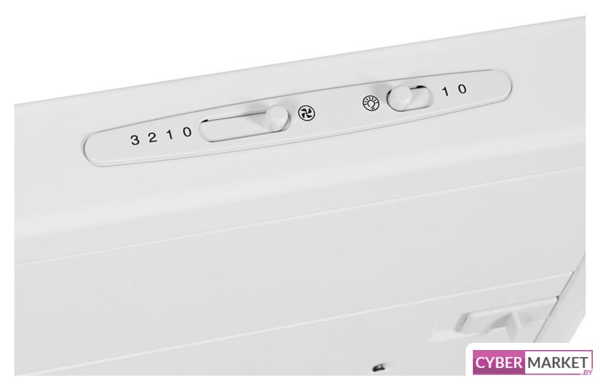 конструкция плоская, монтаж настенный, ширина 49.6 см, управление механическое/кнопочное, производительность мотора 455 м³/ч, цвет белый