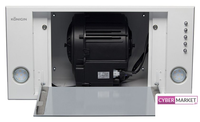 конструкция скрытая, монтаж для встраивания, ширина 59.6 см, управление механическое/кнопочное, производительность мотора 1000 м³/ч, цвет черный