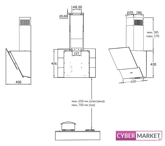 конструкция скрытая, монтаж для встраивания, ширина 59.8 см, управление сенсорное/жестами, производительность мотора 1080 м³/ч, цвет черный