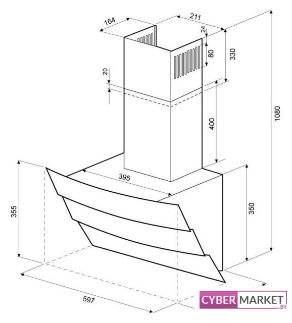 конструкция коробчатая, монтаж настенный, ширина 35 см, управление электронное/кнопочное, производительность вытяжки 350 м³/ч, производительность мотора 900 м³/ч, цвет белый