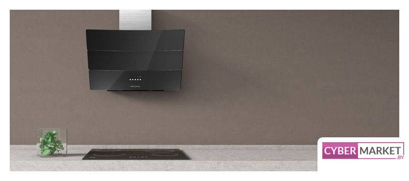 конструкция коробчатая, монтаж настенный, ширина 90 см, управление механическое/кнопочное, производительность мотора 550 м³/ч, цвет черный