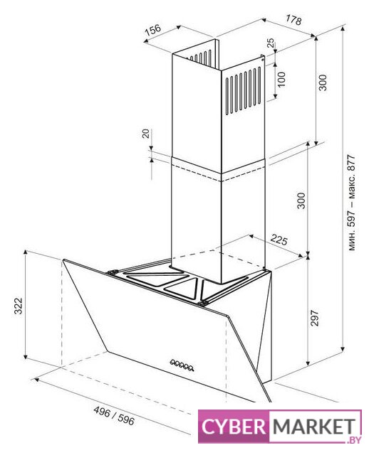 конструкция наклонная, монтаж настенный, ширина 49.6 см, управление механическое/кнопочное, производительность мотора 780 м³/ч, цвет белый