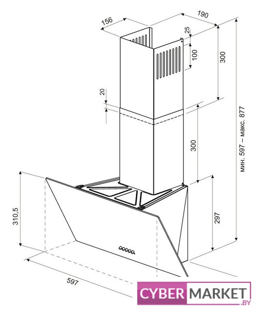 конструкция наклонная, монтаж настенный, управление механическое/кнопочное, производительность мотора 800 м³/ч, ширина 60 см