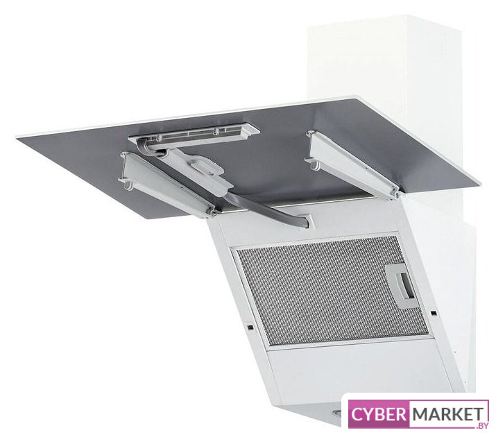 конструкция наклонная, монтаж настенный, ширина 90 см, управление механическое/кнопочное, производительность вытяжки 850 м³/ч, цвет белый