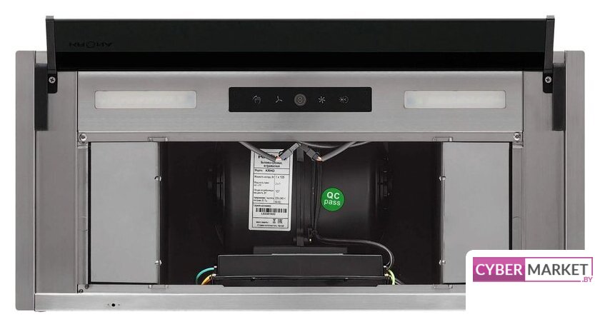 конструкция купольная, монтаж настенный, ширина 59.8 см, управление механическое/кнопочное, производительность мотора 800 м³/ч, цвет черный