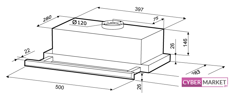 конструкция скрытая, монтаж для встраивания, ширина 52 см, управление механическое/слайдерное, производительность мотора 450 м³/ч, цвет черный
