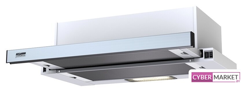 конструкция телескопическая, монтаж для встраивания, ширина 59.5 см, управление механическое/кнопочное, производительность мотора 650 м³/ч, цвет белый