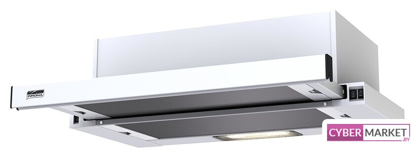 конструкция плоская, монтаж настенный, ширина 50 см, управление механическое/слайдерное, производительность вытяжки 160 м³/ч, производительность мотора 420 м³/ч, цвет белый