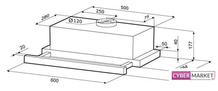 конструкция скрытая, монтаж для встраивания, ширина 52 см, управление механическое/кнопочное, производительность мотора 600 м³/ч, цвет черный