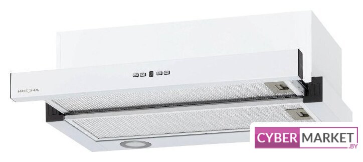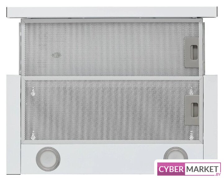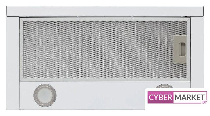 конструкция скрытая, монтаж для встраивания, ширина 53 см, управление механическое/кнопочное, производительность мотора 650 м³/ч, цвет белый