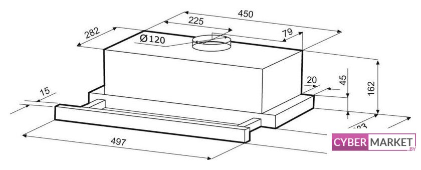 конструкция купольная, монтаж настенный, управление механическое/слайдерное, производительность мотора 430 м³/ч, ширина 50 см