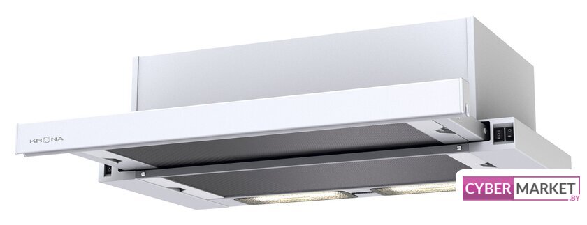 конструкция скрытая, монтаж для встраивания, ширина 53 см, управление механическое/кнопочное, производительность мотора 1080 м³/ч, цвет белый