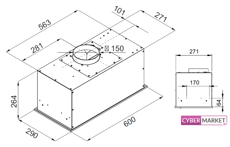 конструкция Т-образная, монтаж настенный, ширина 90 см, управление механическое/кнопочное, производительность мотора 850 м³/ч, цвет нержавеющая сталь/черный