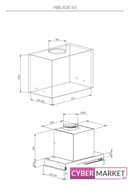 конструкция Т-образная, монтаж настенный, управление механическое/кнопочное, производительность вытяжки 427 м³/ч, производительность мотора 450 м³/ч, ширина 50 см