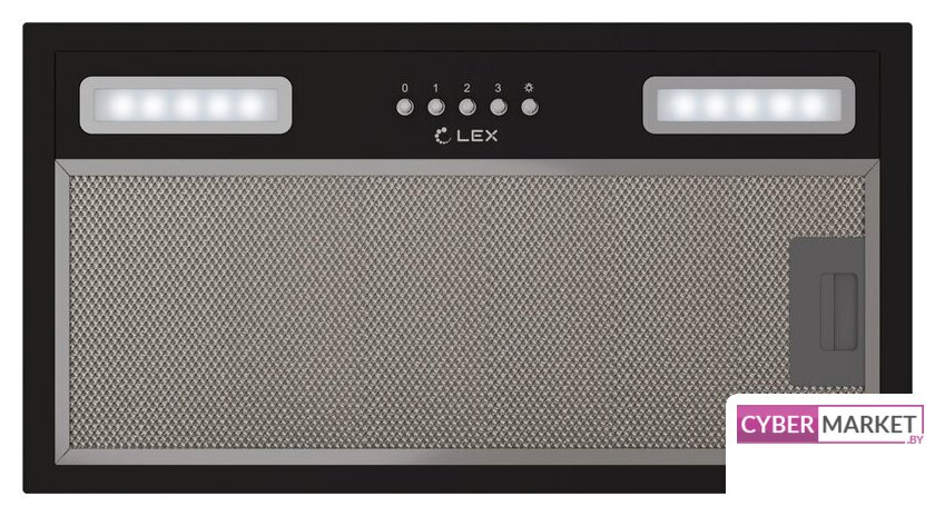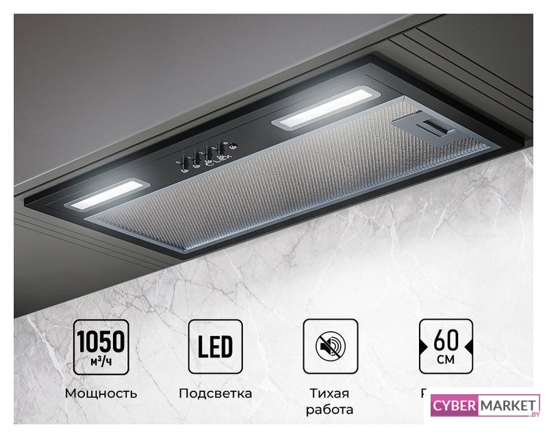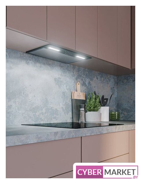 конструкция скрытая, монтаж для встраивания, ширина 51.8 см, управление сенсорное, производительность вытяжки 210 м³/ч, производительность мотора 1000 м³/ч, цвет черный