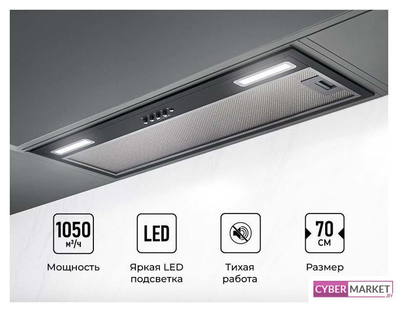 конструкция купольная, монтаж настенный, управление электронное/кнопочное, производительность мотора 600 м³/ч, ширина 60 см