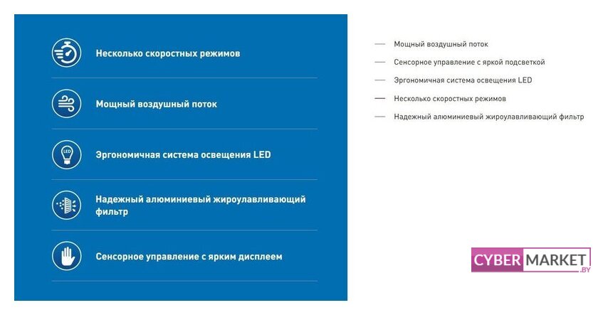 конструкция купольная, монтаж настенный, ширина 59.8 см, управление механическое/кнопочное, производительность мотора 800 м³/ч, цвет белый
