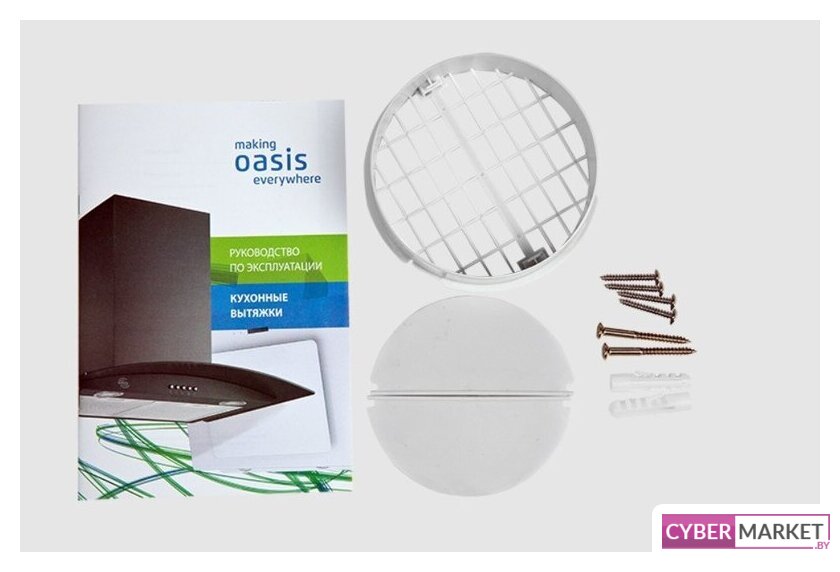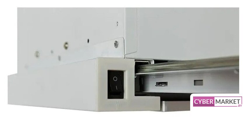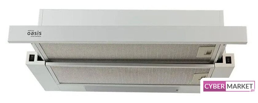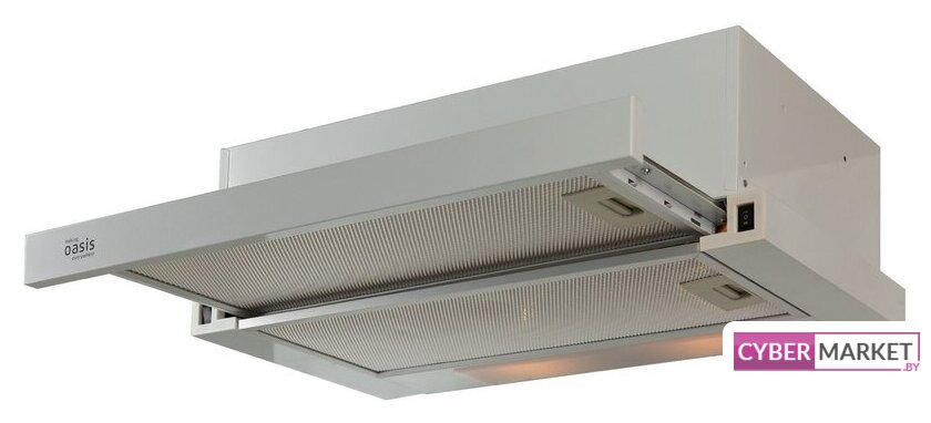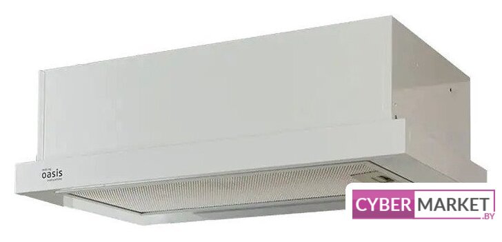 конструкция скрытая, монтаж для встраивания, ширина 59.8 см, управление механическое/кнопочное, производительность мотора 520 м³/ч, цвет белый